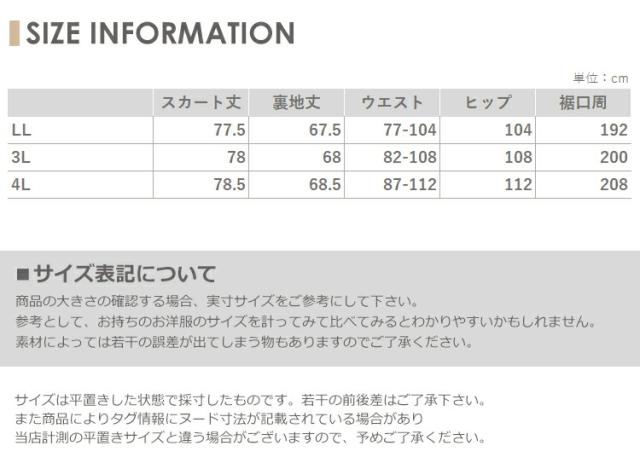 LL:スカート丈77.5 裏地丈67.5 ウエスト77-104 ヒップ104 裾周192