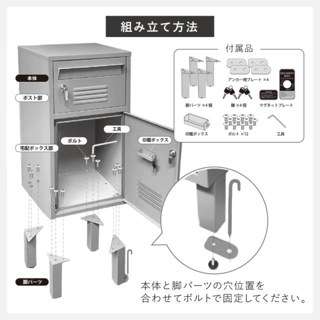 ■付属品:足パーツ×4個、アンカー用プレート×4、鍵×4個、印鑑ボックス(キーフック付き)、配達業者向け説明マグネットプレート、工具、ボルト×12