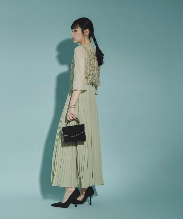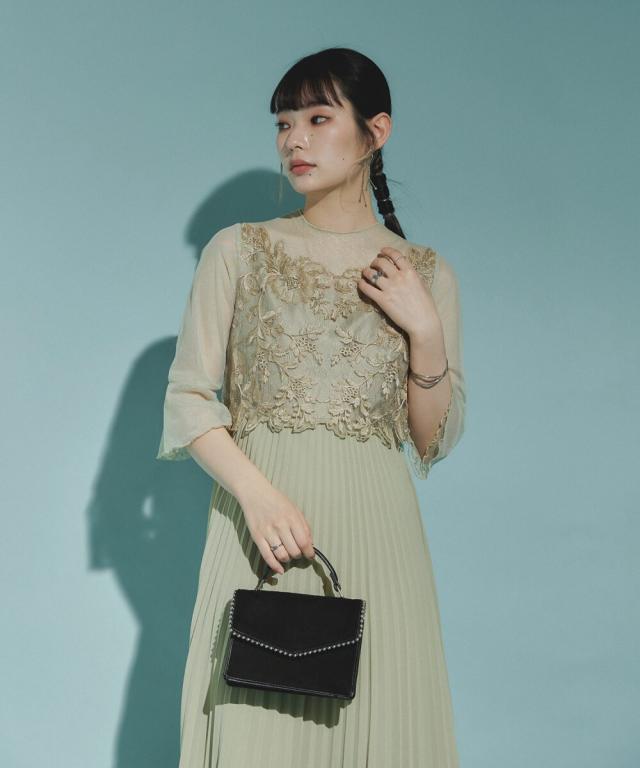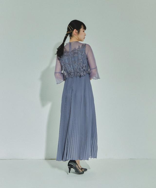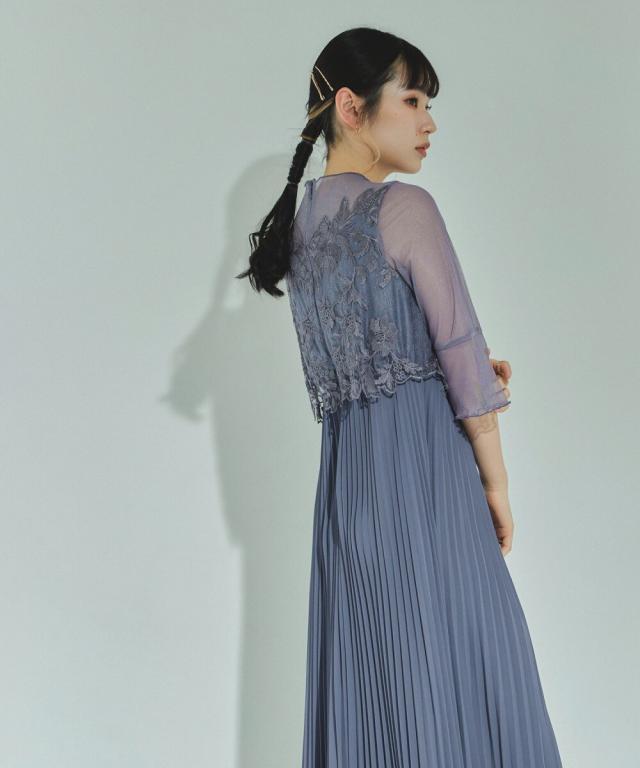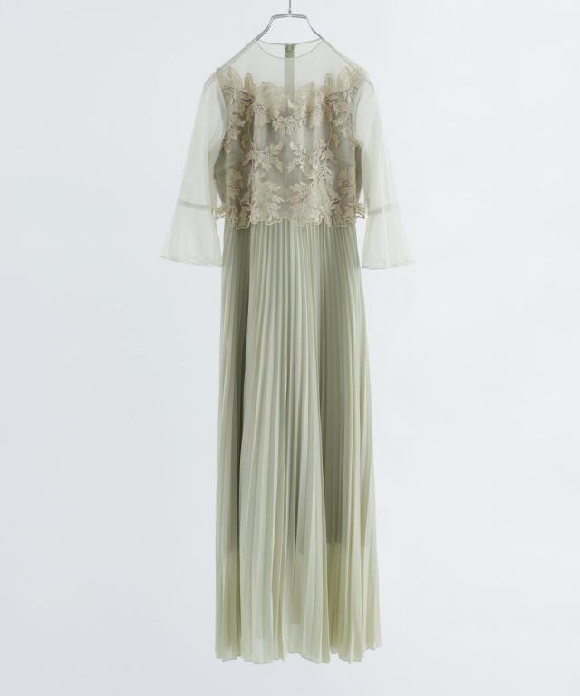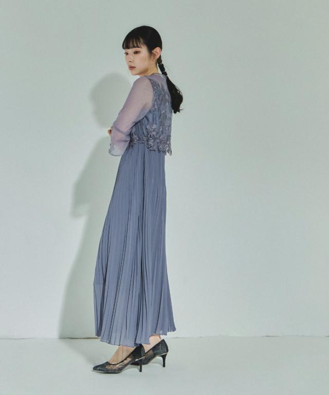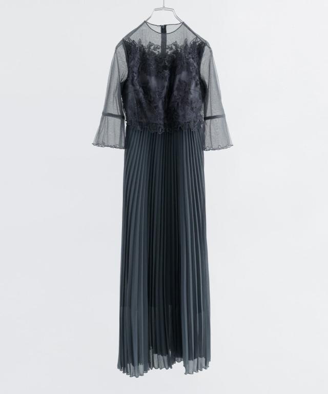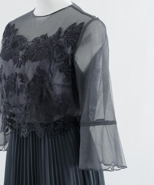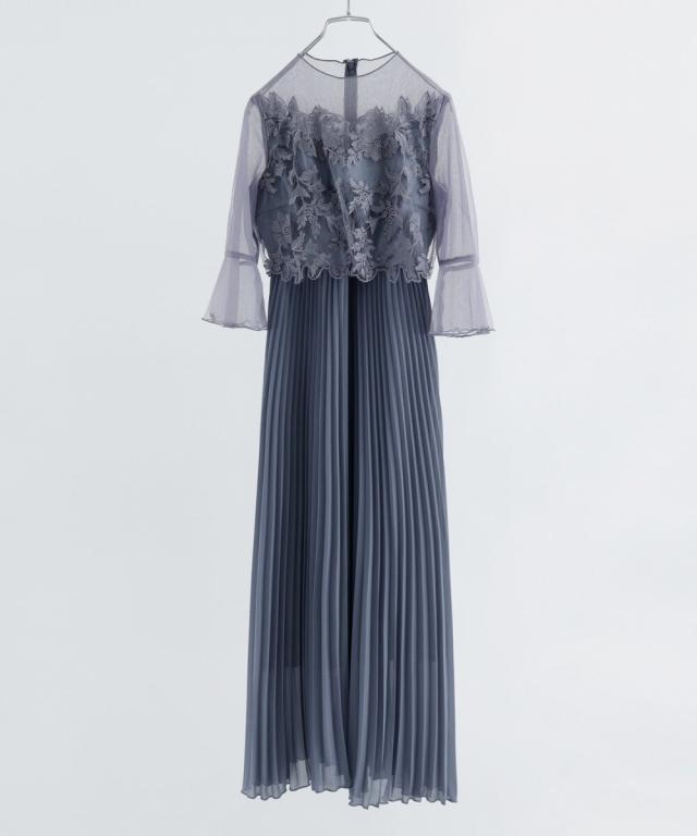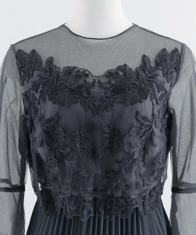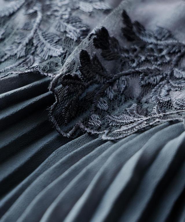 胸元の繊細ななフラワーレースとプリーツを組み合わせた