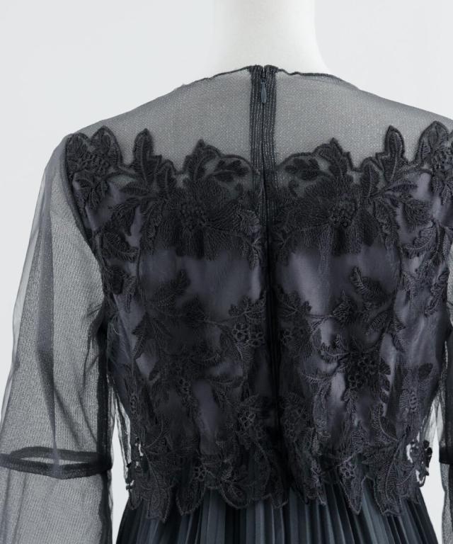 デコルテから袖にかけて細かなラメの入ったチュール素材で華やかさをプラス。