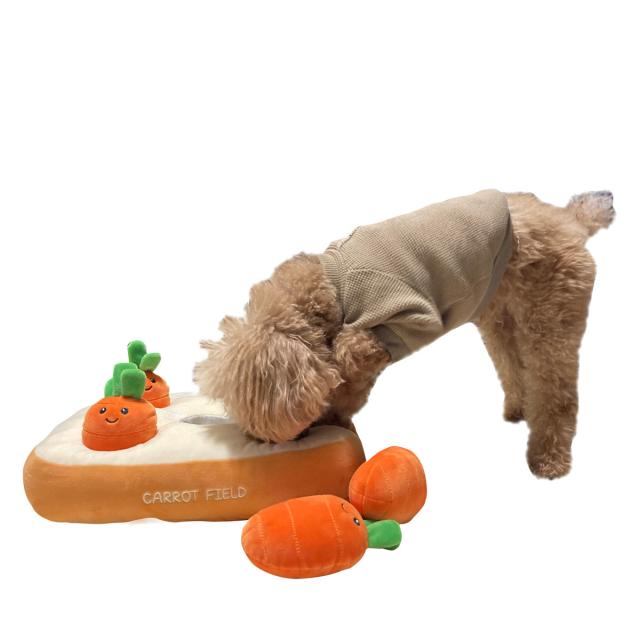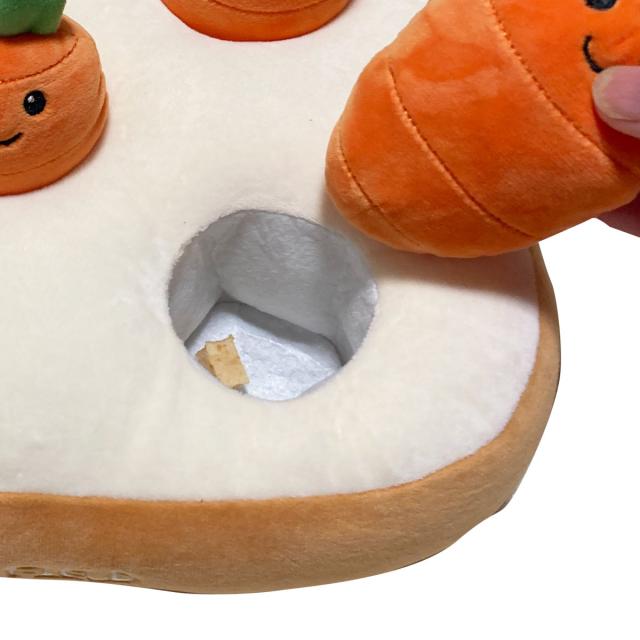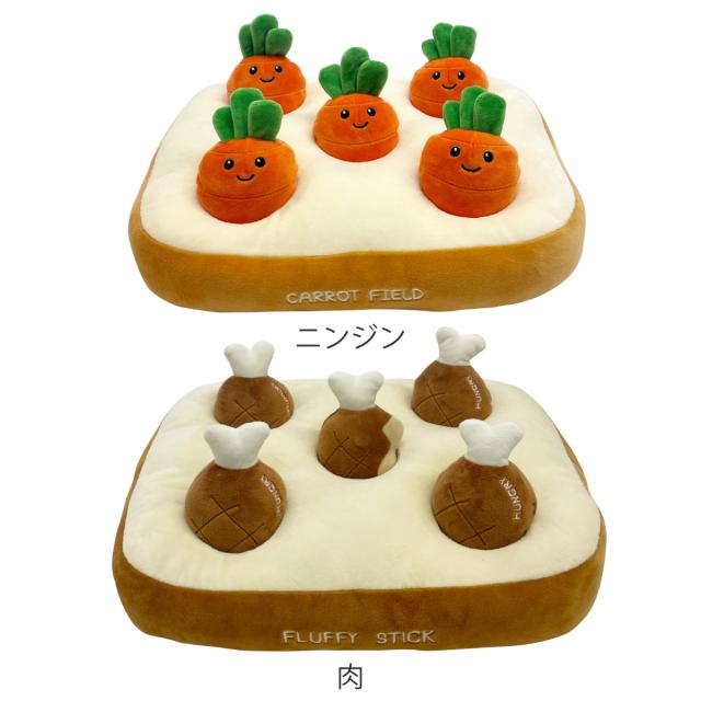 飼い主さんが隠したお菓子をワンちゃんが臭覚を使って探したり、ぬいぐるみを噛んで遊ぶこともできる知育おもちゃです。ユーモアのある可愛いデザインのニンジンと肉の2種類があります。