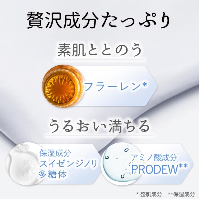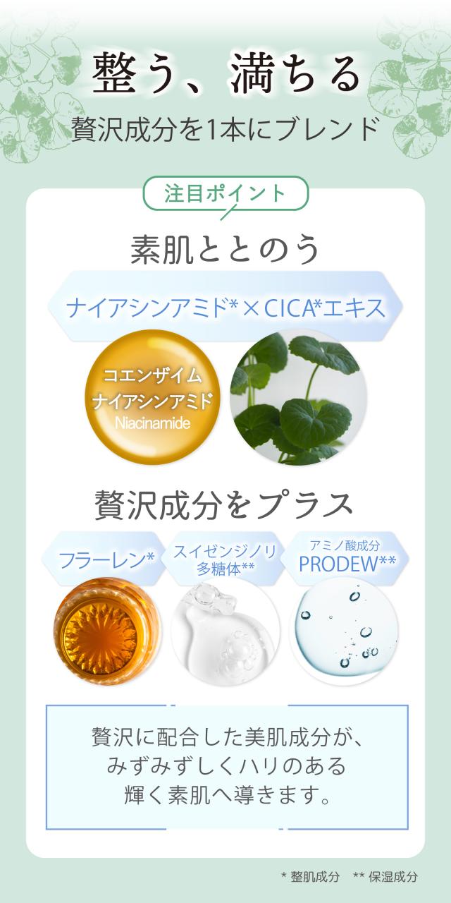 ナイアシンアミド*×CICA*エキスに加え、フラーレン*、スイゼンジノリ多糖体**、アミノ酸成分PRODEW**の3つの美肌成分を配合し、美しさあふれる肌へ。