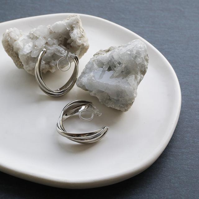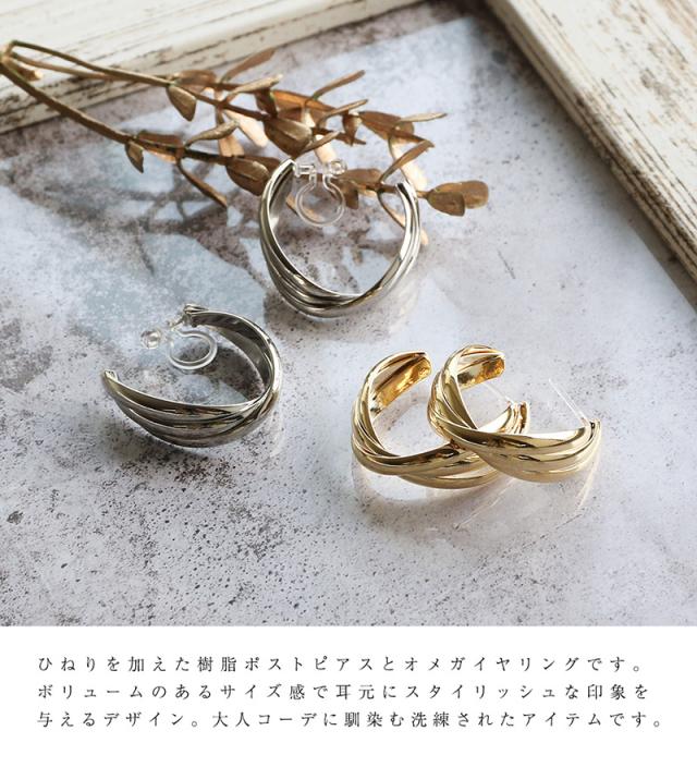 | ひねりを加えた樹脂ポストピアスとオメガイヤリングです。 ボリュームのあるサイズ感で耳元にスタイリッシュな印象を与えるデザイン。 大人コーデに馴染む洗練されたアイテムです。 | |