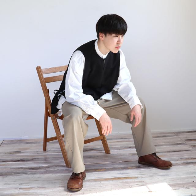 ■ Audience国産ライン、“Upscape Audience” Audienceの世界観とコンセプトはそのままに、国内生産に絞ったものづくりでより高いクオリティの製品を打ち出しています。 ジャケット類やボトムスだけでなく、カットソーやシャツなど普段使えるアイテムも幅広く取り揃え、いつも着るものだからこそ、安心して着られる製品を展開しています。 日本製ならではの美しい仕上がりとこだわりのデザインは、さり気なくコーディネートのセンスを引き立てます。 ■ Audience オーディエンス 商品詳細 スウェーデン軍のミリタリーサージカルガウンがイメージソース。 両脇につく2つの紐で閉じる個性的なデザインが特徴的なアイテムです。 マンネリ化してしまう春夏シーズン。いつものTシャツやシャツに一枚羽織るだけで、ワンランク上のコーディネートの完成。 内側に取り付けられた貼り付けポケットに両脇から手を入れることも可能です。 ドライタッチな麻調の擬麻(ギマ)を使用したリネンライクな素材感が特徴です。 ポリエステルなので乾きやすく、また、シワにもなりにくいため、リネンに比べて圧倒的に比べて扱い易いのが魅力です。 麻のような見た目と肌さわりで清涼感があり、表面には凹凸があり、汗をかいても快適な着心地を実現します。 天然素材のような風合いでありながら、合成繊維素材ならではの扱いやすさ、機能性が魅力のReflax(リフラクス)(R)。 天然素材のようなナチュラル感と、ドライな風合いが特徴のファブリックです。 表面感のある織りで、独特の表情に仕上がっています。 チクチク感が無く、心地良い涼しげな風合いで、暑い時期にも抵抗なくご着用可能です。また、ポリエステルですが、織り方で生地にストレッチ性を出しているので、 着心地も快適です。 |