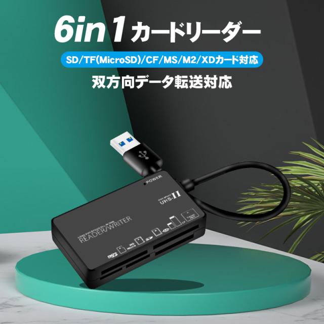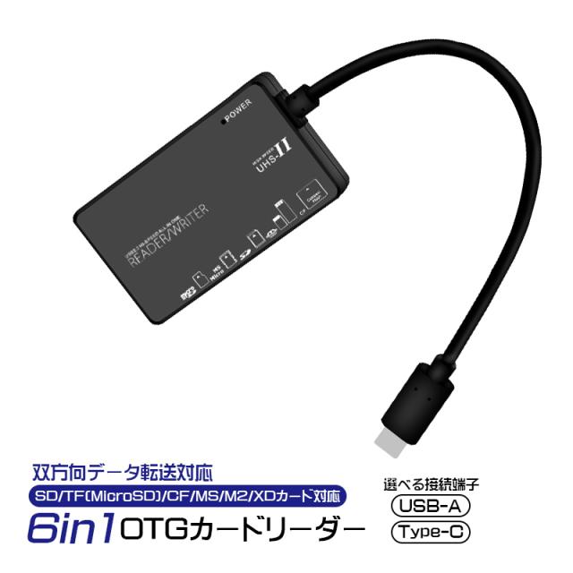 6in1 OTGカードリーダー SD TF(MicroSD) CF MS M2 XDカード対応 選べる接続端子 USB-A Type-C 双方向データ転送対応 最大480Mbps ドライバー不要 バスパワー 外部電源不要 読み書き ブラック 【送料無料】