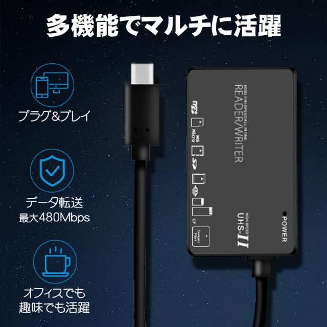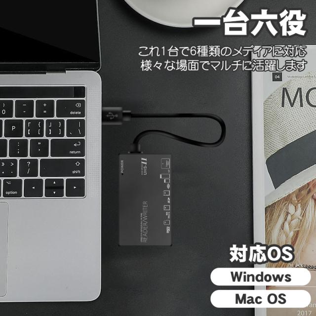 | 6in1 OTGカードリーダー SD TF(MicroSD) CF MS M2 XDカード対応 選べる接続端子 USB-A Type-C 双方向データ転送対応 最大480Mbps ドライバー不要 バスパワー 外部電源不要 読み書き |