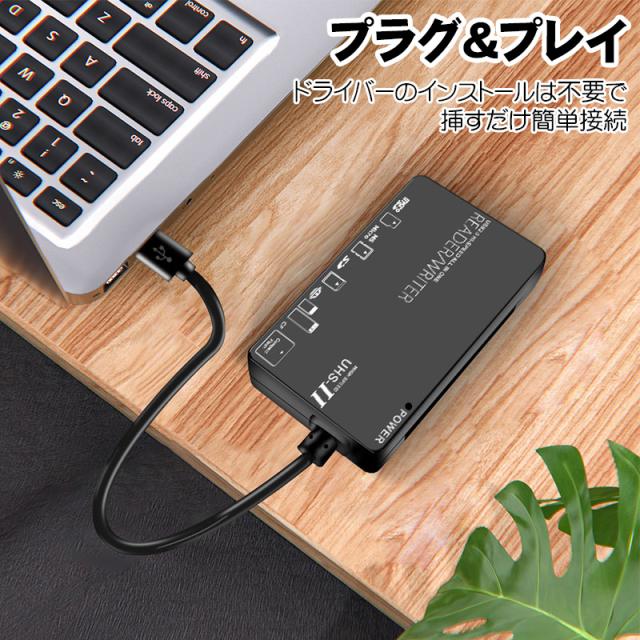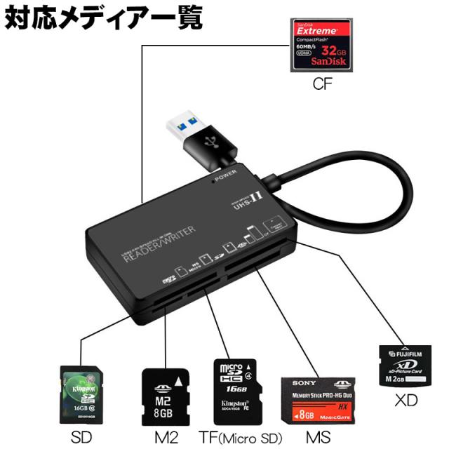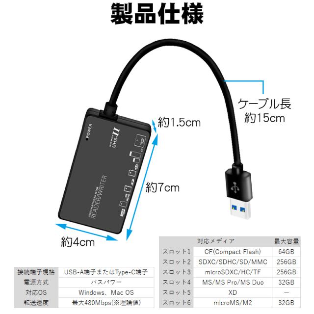 | 1台で6種類のメディアカードに対応する6-in-1 多機能カードリーダーです。 読み取り、書き込みの双方向データ転送に対応しています。 接続端子はUSB-A端子とType-C端子の2タイプから、お持ちの端末に合ったものをお選び頂けます。 プラグ&プレイで挿すだけ簡単接続可能。ドライバーのインストールは不要です。 バスパワータイプなので、外部電源は不要です。 コンパクトで薄型なので、持ち運びにも便利です。 【対応メディアと対応最大容量】 スロット1:CF(Compact Flash) 64GBまで スロット2:SDXC/SDHC/SD/MMC 256GBまで スロット3:microSDXC/HC/TF 256GBまで スロット4:MS/MS Pro/MS Duo 32GBまで スロット5:XD スロット6:microMS/M2 32GBまで |