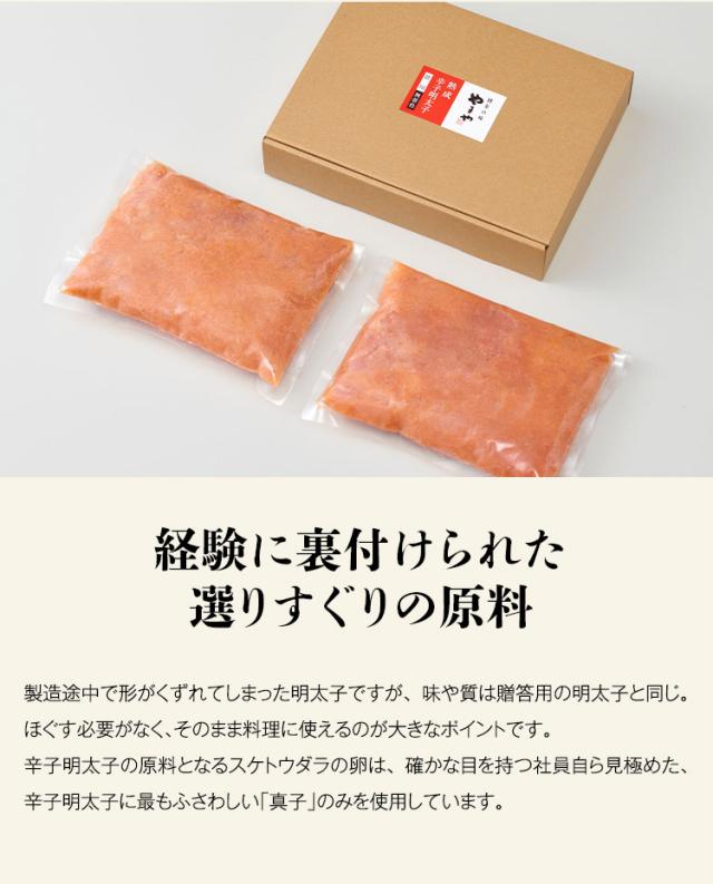 製造過程において、薄皮が破れ端が切れた物など、形が崩れてしまった明太子です。
