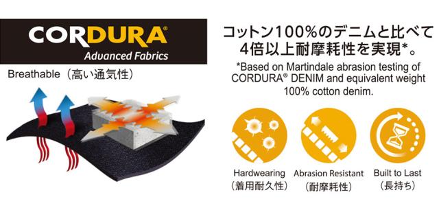 コットン100%のデニムと比べて4倍以上の摩耗性を実現するストレッチ性も兼ね備えたCORDURA(コーデュラ)デニム使用
