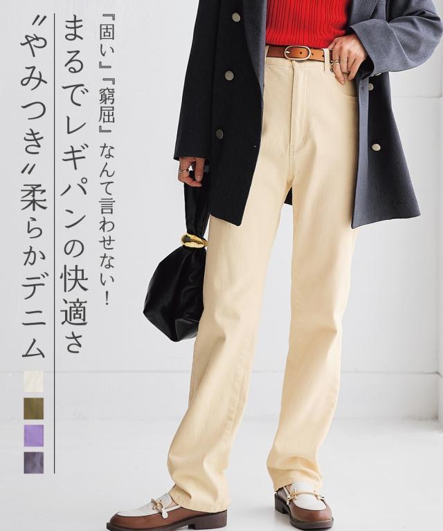 ストレートパンツ 大きいサイズ レディース ストレッチ ゆるリラックス カラー デニム ゆったり ヒップ 選べる2レングス セサミグレー/ソフトカーキ/ハニーマスタード/バニラソフト L/LL/3L/4L/5L 美脚 ボトムス ズボン ニッセン nissen