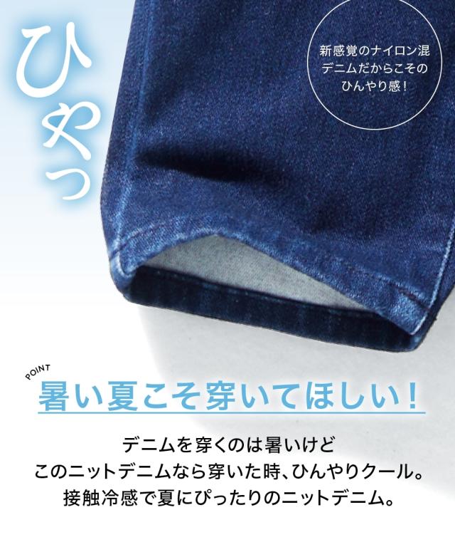 【更なる進化を。累計50000枚を誇るスマイルランド1ひんやりニットデニムから新色登場☆】 夏こそ履きたい新感覚のニットデニム。はいた時、ひんやりクールな接触冷感素材で夏にぴったり。本格デニムに見えて実は・・・・・・カットソーなんです。。。 デニム顔負けのしっかりこだわった加工感も超魅力のやわらかニットデニム。 弊社の基準の2倍のひんやり数値を叩き出したこのひんやり感はナイロンが35%も入ったニットデニムだからこそ実現できました。 今回は糸からこだわり、肌に触れるたび涼しく感じる特殊な系、ソフトクールエク