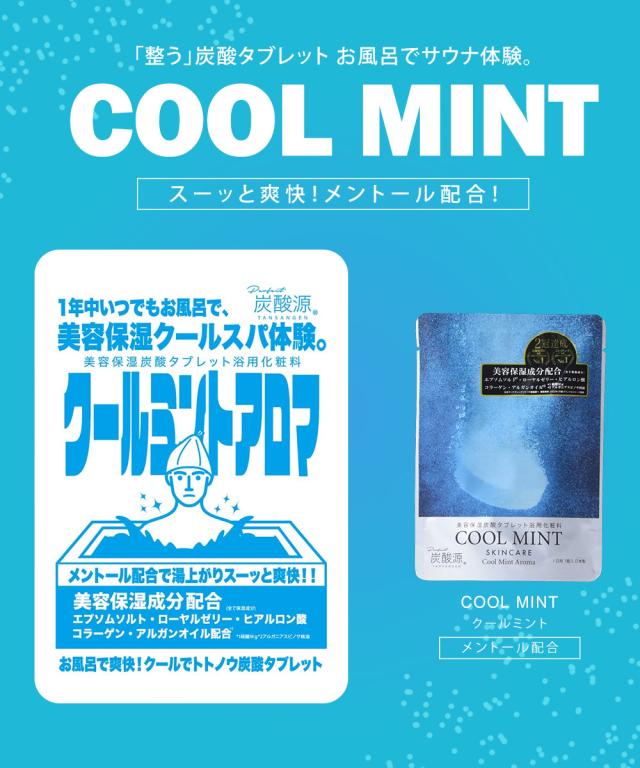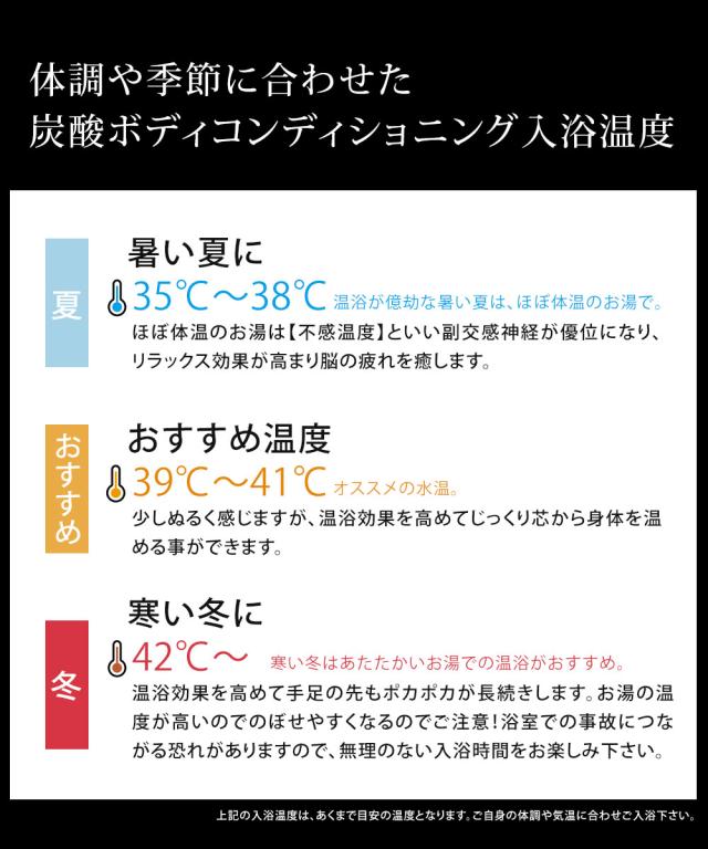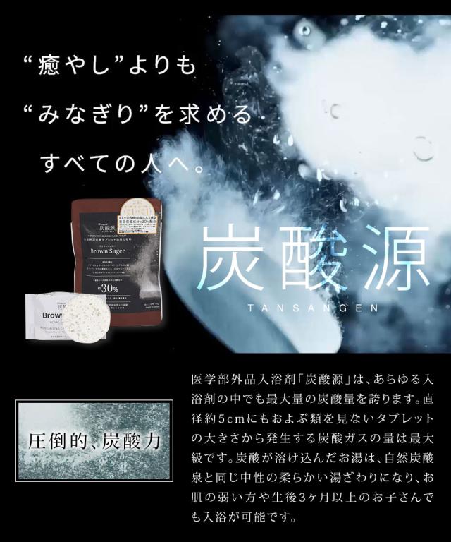 医学部外品入浴剤「炭酸源」は、あらゆる入浴剤の中でも最大量の炭酸量を誇ります。直径約5cmにもおよぶ類を見ないタブレットの大きさから発生する炭酸ガスの量は最大級です。炭酸が溶け込んだお湯は、自然炭酸泉と同じ中性の柔らかい湯ざわりになり、お肌の弱い方や生後3ヶ月以上のお子さんでも入浴が可能です。