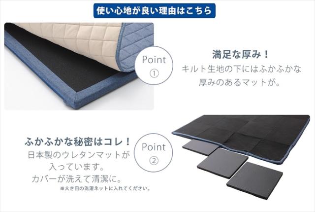 | キルトラグ [中身]ポリエステル綿 [生地]ポリエステル100% カバー [生地]ポリエステル100% マット [中身]ウレタン(モールド成型) [生地]ポリエステル100% |
