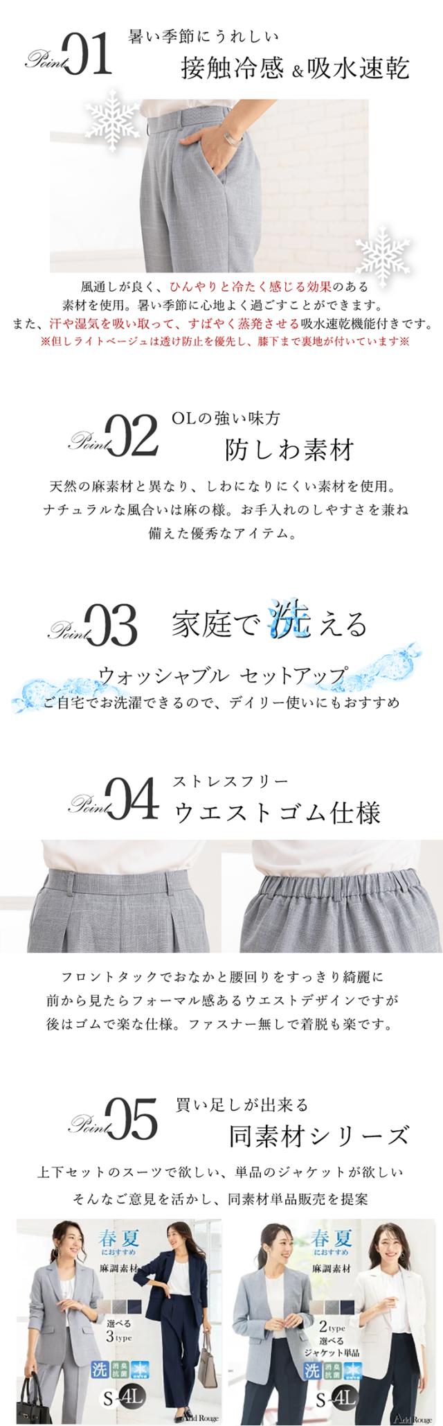 ![]() ![]() ![]() ![]() オフィスカジュアル麻調パンツ単品について 麻のような上品でナチュラルな風合いを表現した生地を使用した、ビジネスシーンに取り入れやすいレディースパンツです。 オフィスカジュアル麻調パンツ単品の詳細