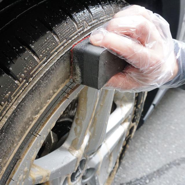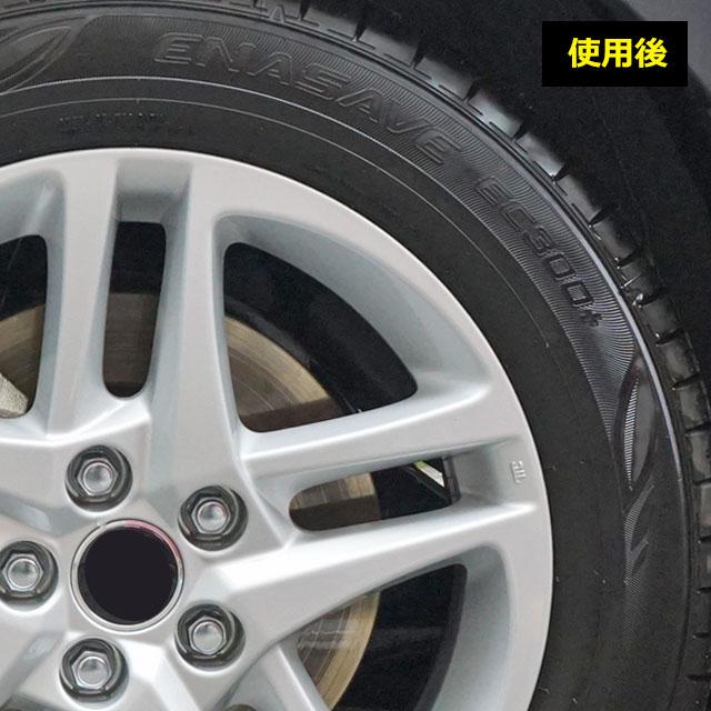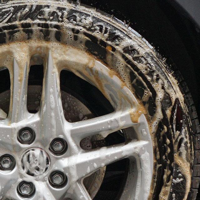 タイヤ・ホイールのしつこい油汚れをスッキリと一撃で落とす専用のクリーナー。