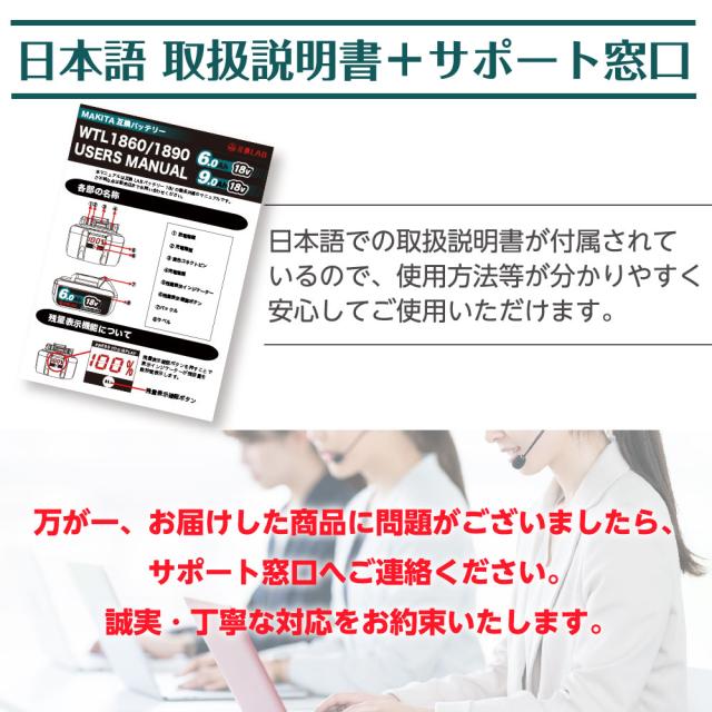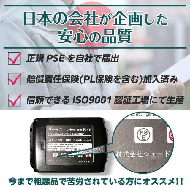 日本の会社が安全性や品質にこだわって企画し、正規のPSEの届け出を自社で行い、ISO9001認証の信頼できる中国工場にて生産しているMAKITA 互換バッテリーです。