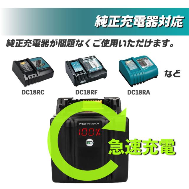 | 対応モデル | マキタはすべてに互換性あり! マキタリチウムイオン電池は同電圧全機種に対応しています。マキタ 電動工具(草刈機 掃除機、チェーンソー、集塵機、ブロアー、空気入れなど18Vの機種) TD171DRGX、TD149DRFX、TP141DRGX/TP141DRTX、TW285DRGX、HP481DRGX/HP481DRTX、HR244DRGX、LS610DRG/DZ、TM51DRG/TM51DRT/TM51DRM/TM51DRF、HS611DRGX、HS631DGXS、HS631DRGX、JV182DRF、KS511DRGX、JR188DRGX/JR188DRG、JRMUB184DRGX、UB182DRF、GA404DRGXN/GA404DRGN/GA504DRGXN/GA504DRGN、MUC254DRGX/DGXR、CL281FDRFW/CL281FDFCW、CL282FDRFW/CL282FDFCW、CL182FDRFW、CL180FDRFW/ CL180FDZW、CL181FDRF/W、 MHW080DPG2 等… |