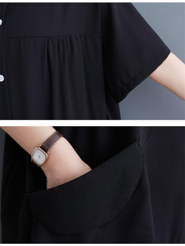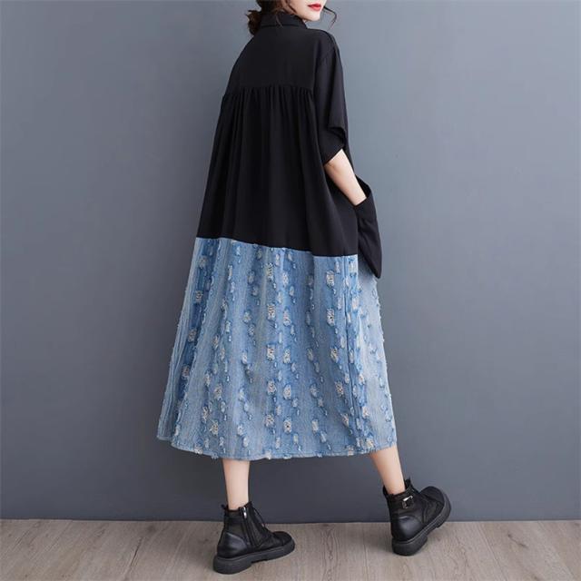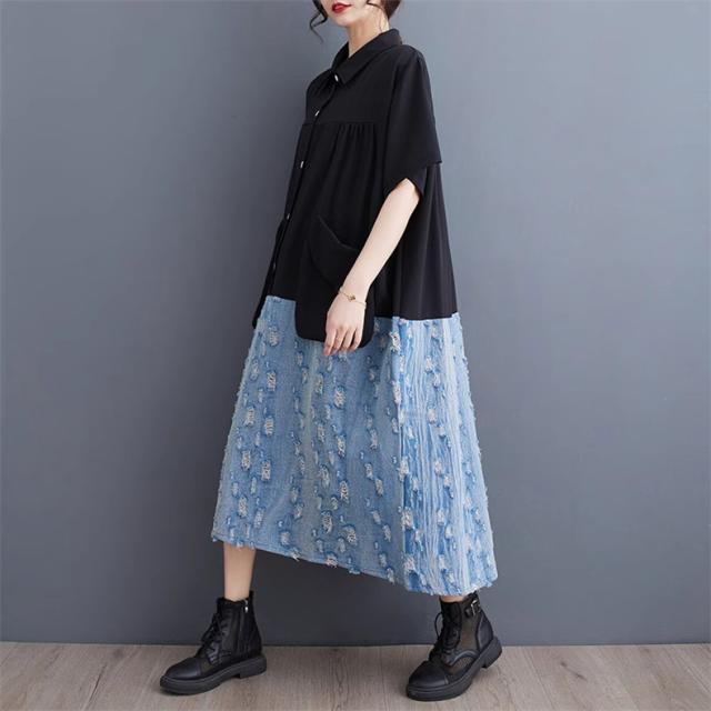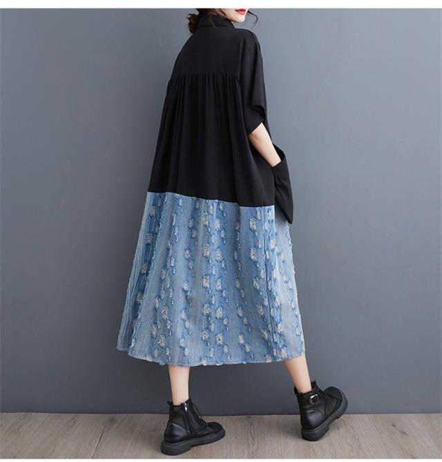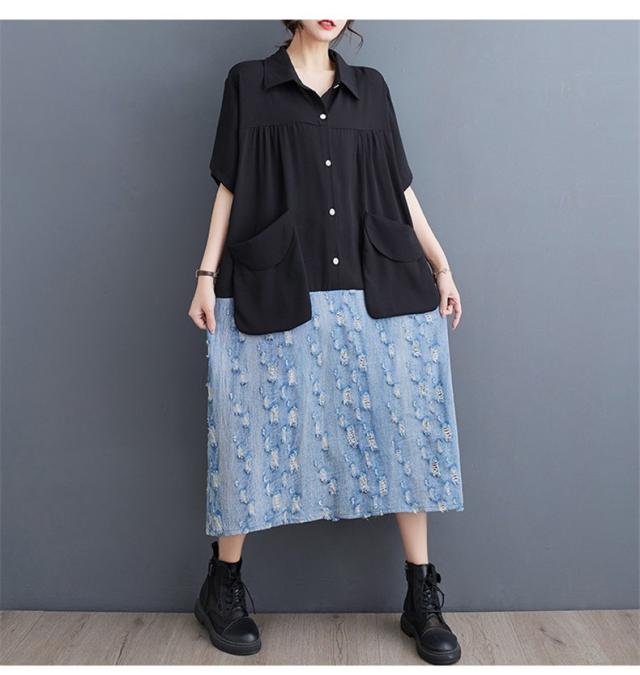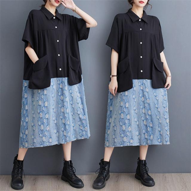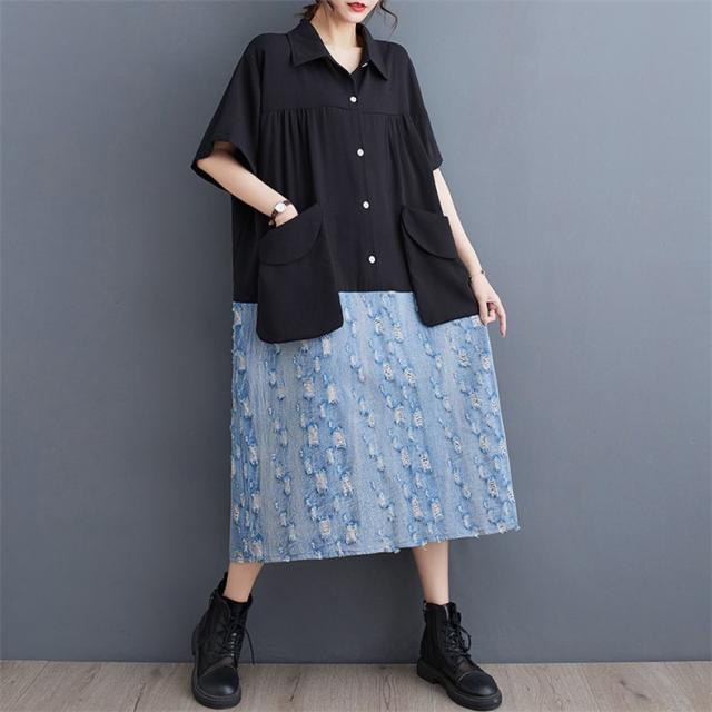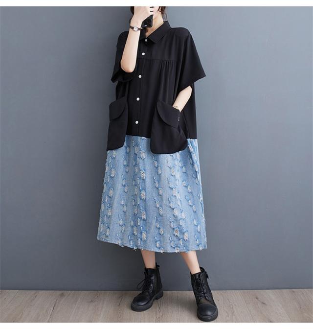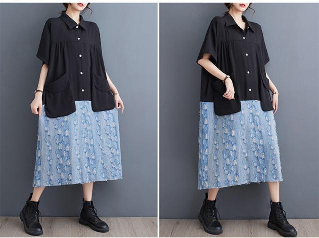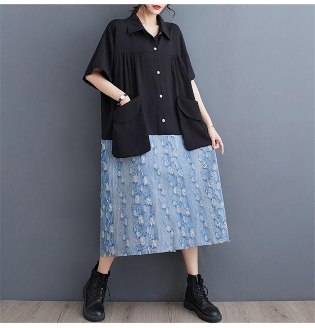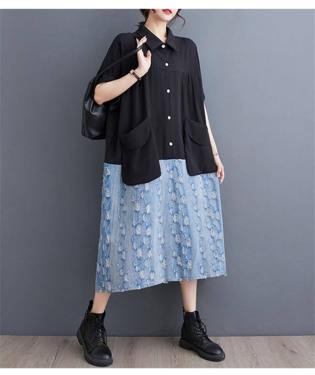 トップス シャツワンピース プルオーバー デニム 切り替え 異素材 大人っぽい レディース 半袖 キレイ見え 体のラインを拾わない