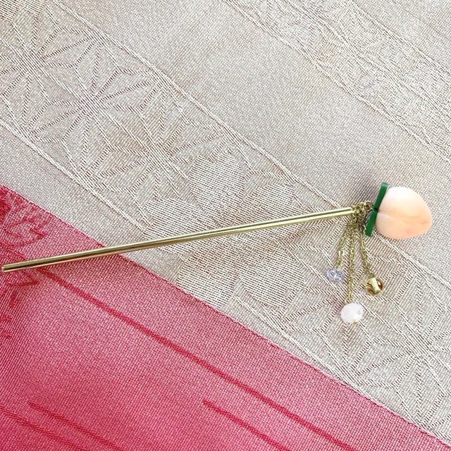 桃モチーフが可愛らしいかんざし。1本挿しにオススメです。モチーフの桃とチェーンが動くたびに揺れて可愛いです。