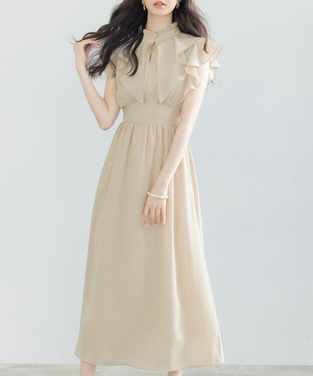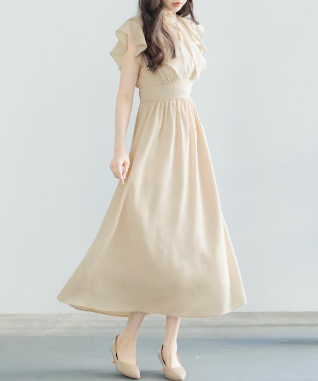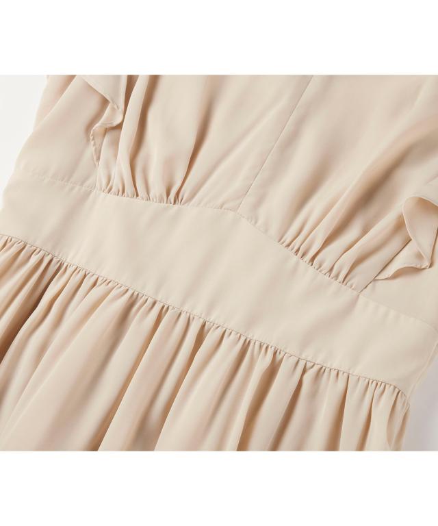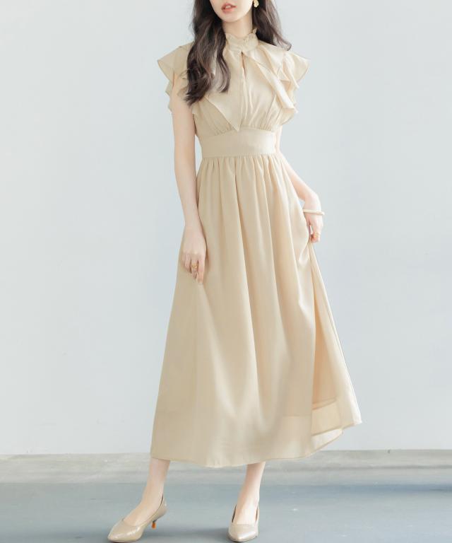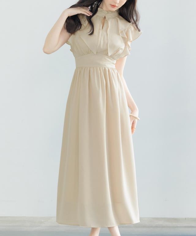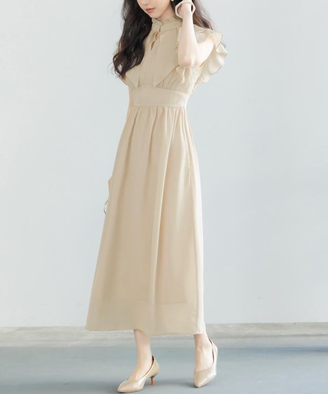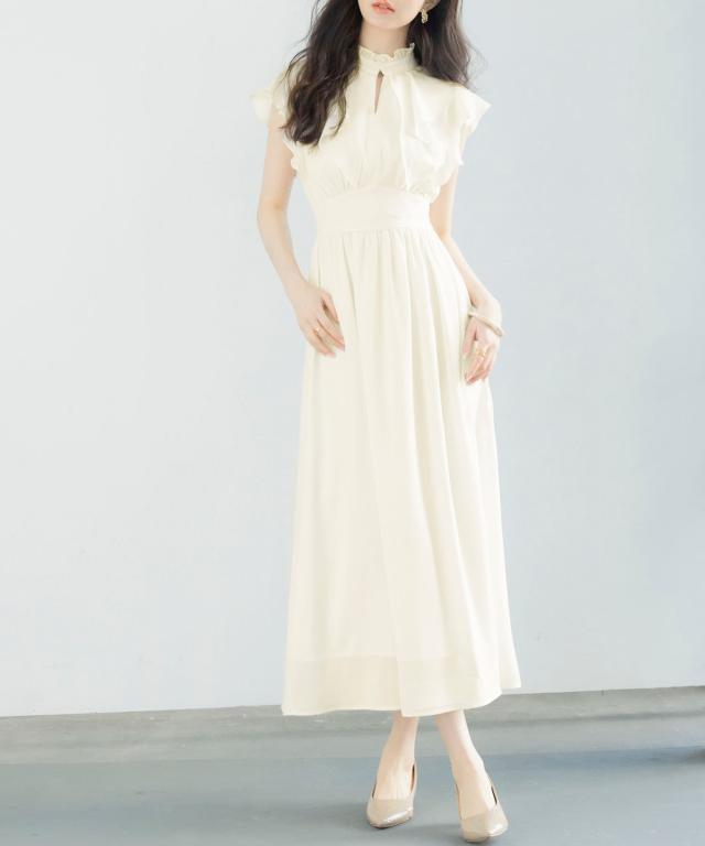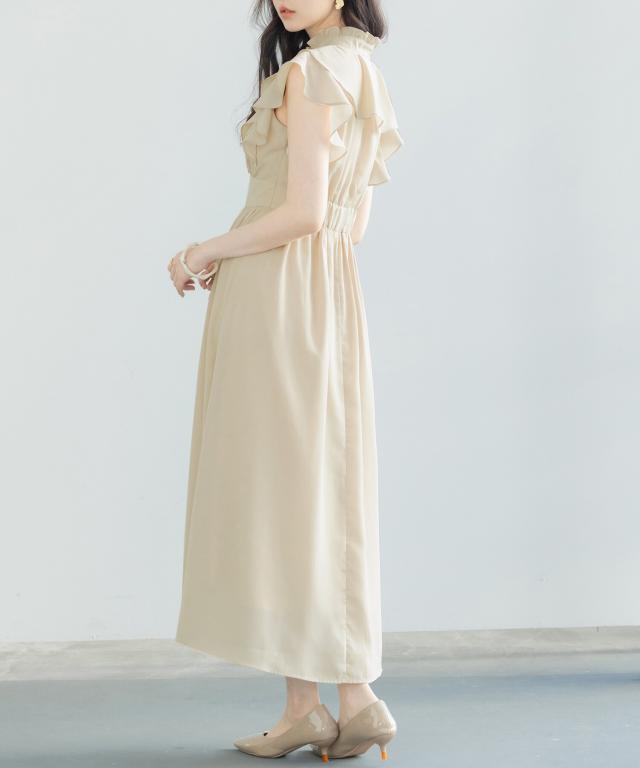 トップスのフリルデザインが目を引くウエストマークされた大人きれいなロング丈ワンピースです。
