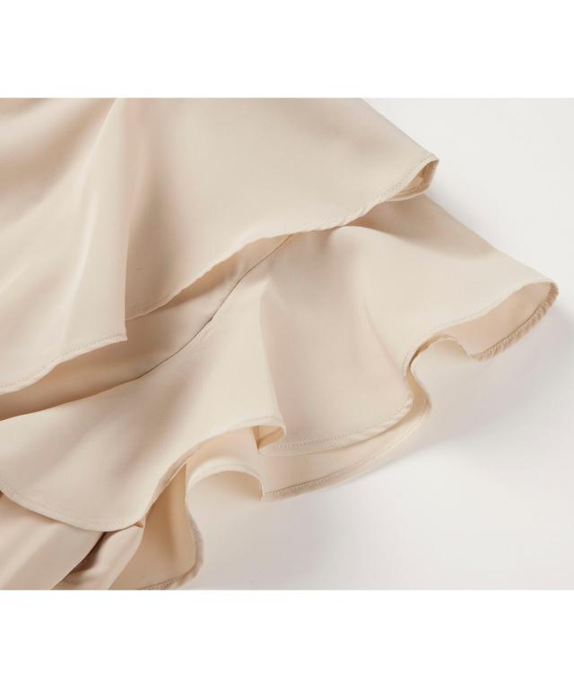 トップスのティアードになったフリルデザインが旬な雰囲気を醸しつつ大人かわいいを演出。トップスにボリュームが集まっていることで全体的なバランスもきれいにまとまります。