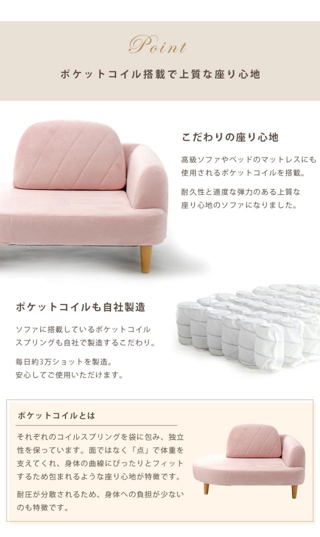| 丸みのあるシルエットで優しいデザインのコンパクトカウチソファにうれしいオットマン付き。 お部屋が狭くなりがちな一人暮らしの方にもぴったりなコンパクトサイズ。 ダイヤモンドステッチを取り入れ、エレガントに仕上げました。 脚を取り外したり、自由にレイアウトできて使いやすく、オットマンはサイドテーブルとしてもお使いいただけます。 高級ソファやベッドのマットレスなどにも使用されるポケットコイルを使用し、耐久性と適度な弾力のある上質な座り心地。 しっかりとした厚みもあり、気持ちのいい座り心地が長く続きます。 安心安全の日本製。 |