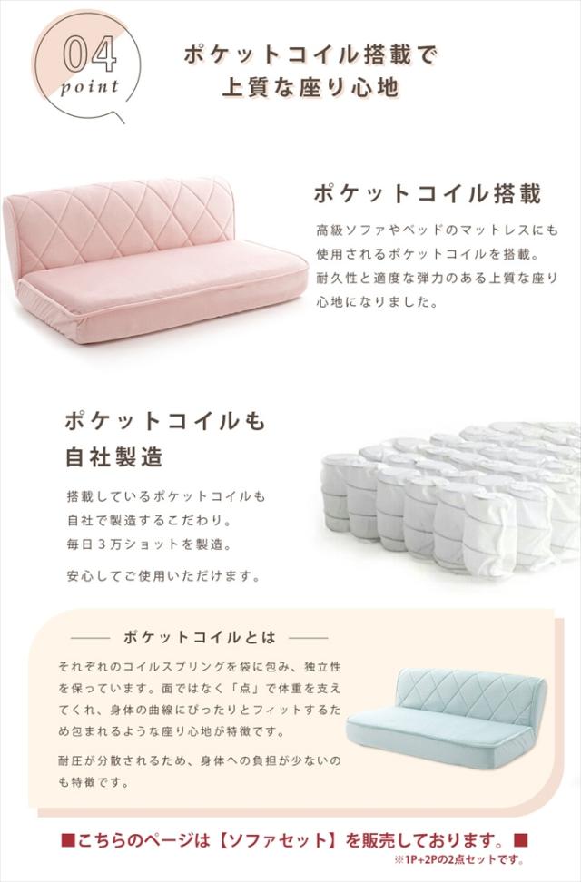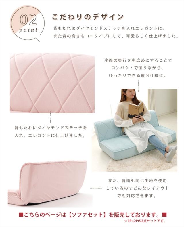 キーワード: 1人用 1人掛け 一人 2人用 2人掛け 二人 リビング おしゃれ ロースタイル 脚なし ソファー ソファ 座る ワンルーム ダイヤモンドステッチ エレガント パステル パステルカラー リクライニング ポケットコイル 日本製
