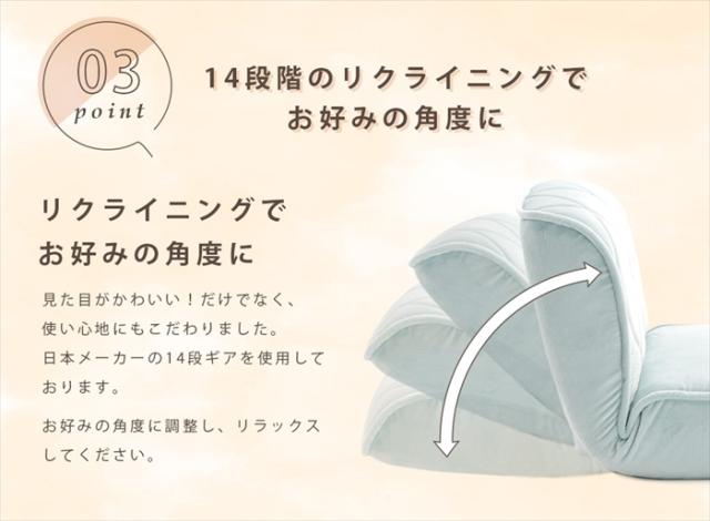 | オトナ女子にぴったり。 おしゃれで可愛い1人掛け、2人掛けのロースタイルソファセットです。 高さのあるソファなどに比べてもお部屋を広く感じる効果もあるので一人暮らしの方にもぴったりです。 14段階のリクライニングでお好みの角度に調節できます。 |