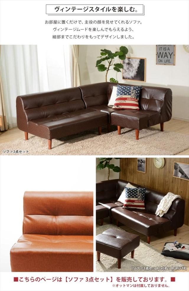 ヴィンテージタイプのシンプルでオシャレなコーナーソファ3点セット。