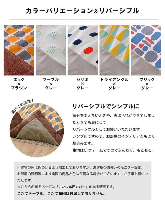 | 長方形のリバーシブルこたつカバー。 カバーはオシャレな北欧柄、5種類からお選び頂けます。 リバーシブルなので、飽きずにお使い頂けます。 生地はCTウォームで、心地よい肌触りです。 |