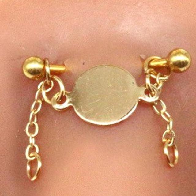 [16G 鼻 耳 臍 軟骨 眉] ゴールドラウンドサーフェイスカーブバーベル 16ゲージ 丸型 プレート タグ 丸い 鎖 チェーン 金色 クサリ ネジボール ボールキャッチ メンズ レディース サージカルステンレス316L オースティン ナサラング ブリッジ 2か所 貫通 男性 女性 横向き