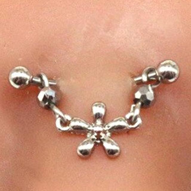 銀色シルバーの16ゲージのカーブバーベルに花とビーズのチャームをセットした眉や鼻や臍などサーフェイス用のボディピアス。