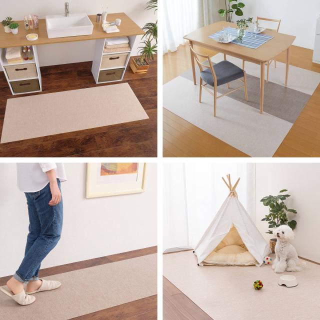 キッチンだけでなく、汚れやすい洗面所や玄関のマットとして、お部屋のポイントラグとして、窓際のフローリング日焼け保護マットとしてなど様々な場所で活躍します。複数枚を組み合わせて使用すれば、レイアウトも楽しむことができます。また、ペットのいるご家庭であれば、食事周りやトイレ周りに使用するのもおすすめです。