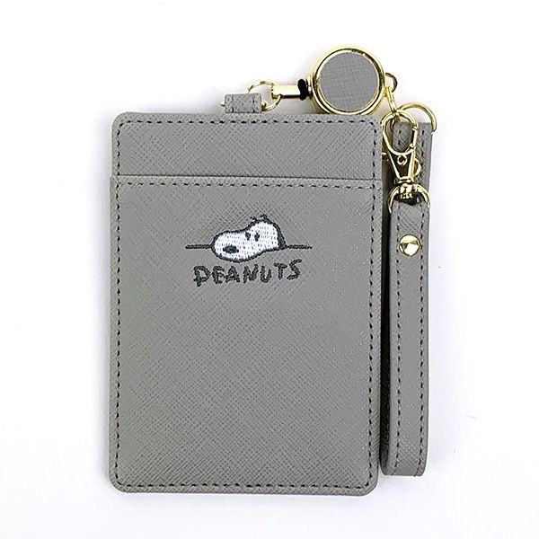 スヌーピー リール付きシングルパスケース デスク刺繍 PEANUT 定期入れ・ICカード グレー マリモクラフト