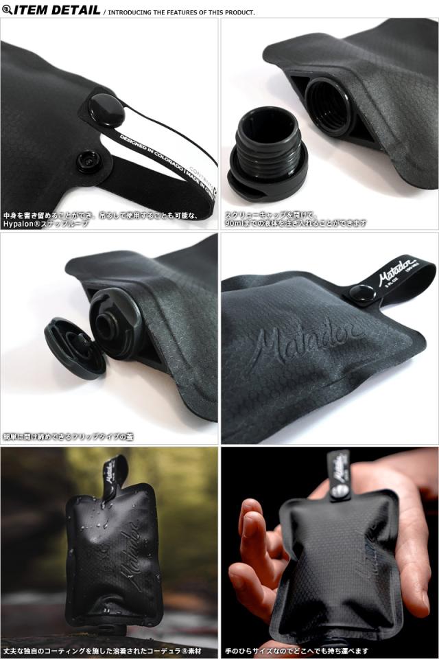 Matadorのフラットパック ボトルはミニマリストに旅行やアウトドアを楽しむためにデザインされた唯一のトラベルボトルです。石鹸からシャンプーやリンス、歯磨き粉などジェル状の液体も簡単に詰めることができます。非常に軽量で、従来のシリコン製トラベルボトルよりも1/5の軽さで、1/3のコンパクトさです。独自のコーティングを施した溶着されたコーデュラ?素材で作られてるため、丈夫で耐水性にも優れた造りになっています。ペンなどでさっと中身を書き留めて置くことができるハイパロン製のストラップが付いていて、野外で吊り下げて使用したり、バックパックなどに外付けして持ち運ぶこともできます。中身が減ると容器も小さくなるので、使用後はコンパクトに持ち帰れます。
