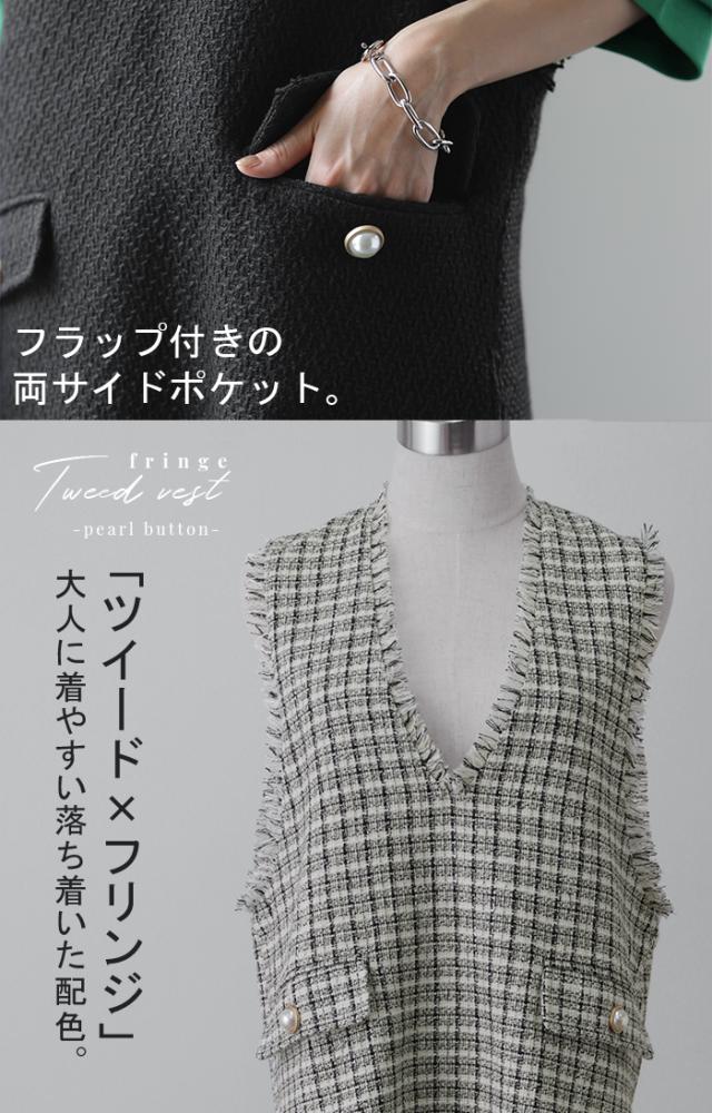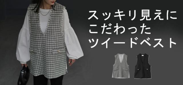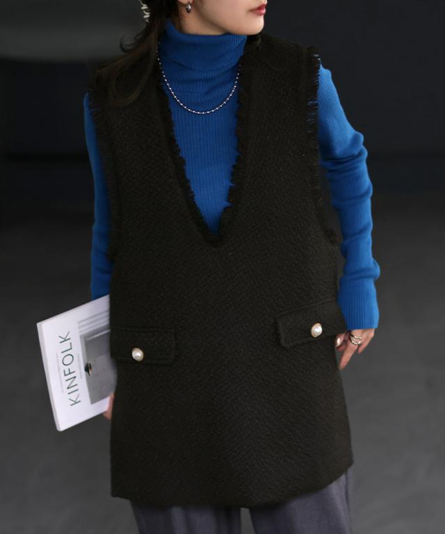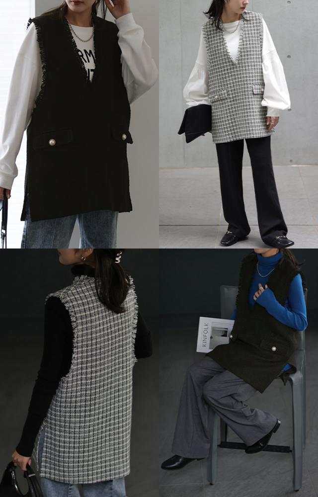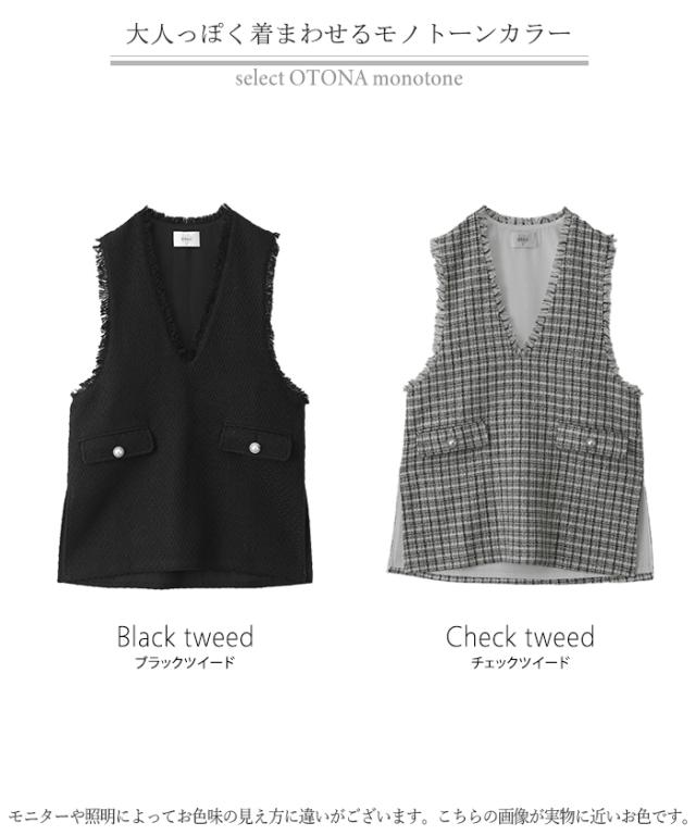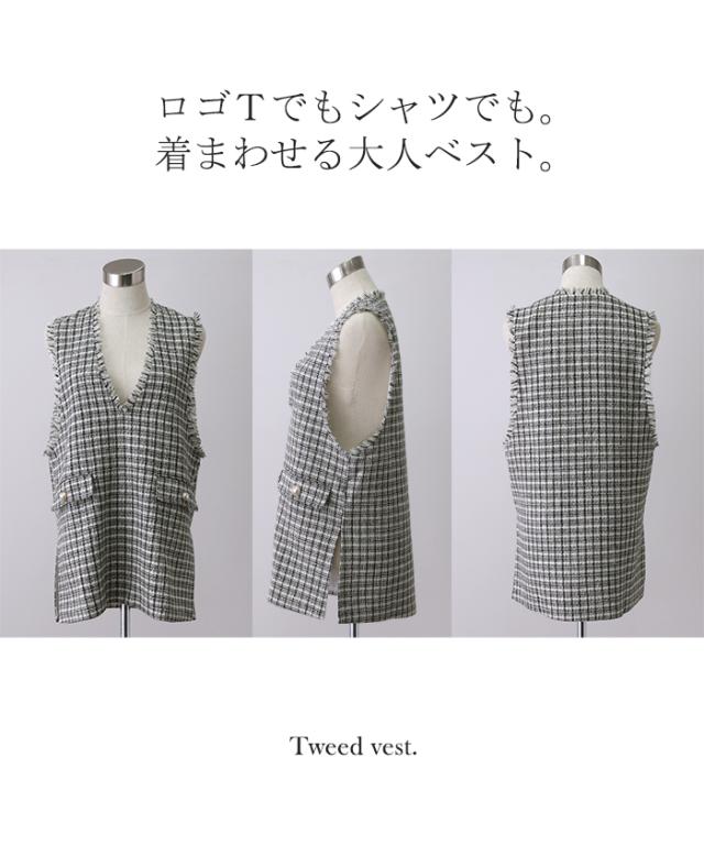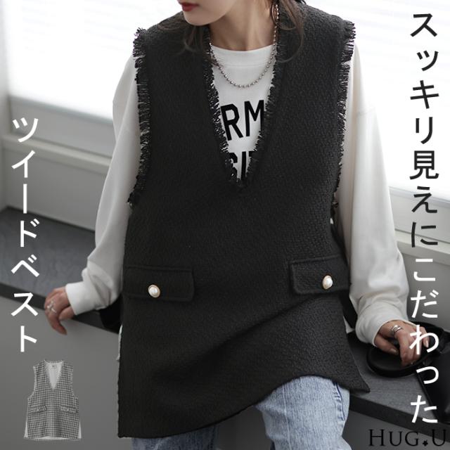 旬。「 お洒落見え 体型カバー 」ツイード ベスト チュニック ツイードベスト レディース レイヤード トップス ロング スリット 深Vネック 重ね着 Vネック お洒落 袖なし お尻が隠れる キレイめ ジレ ビッグ 黒 ブラック 大きいサイズ 冬 秋 HUG.U 秋新作
