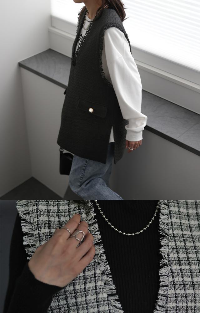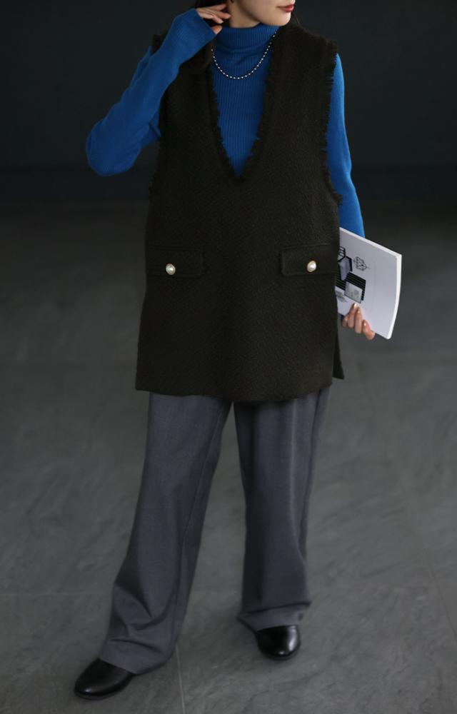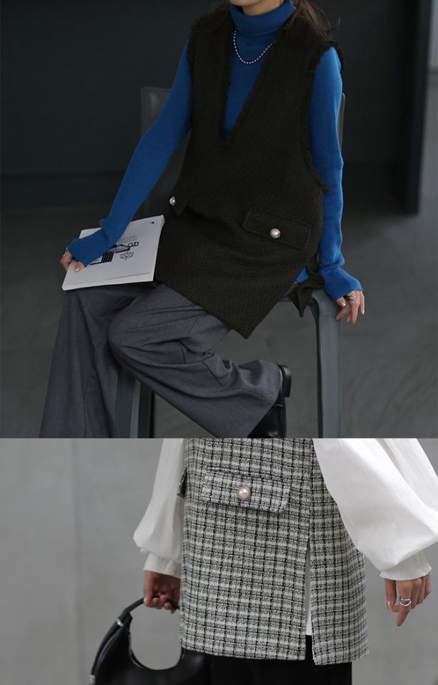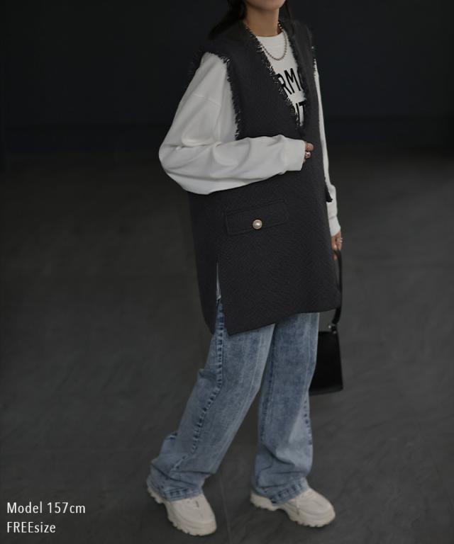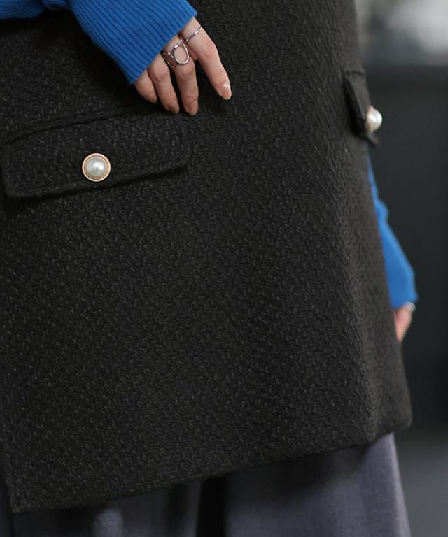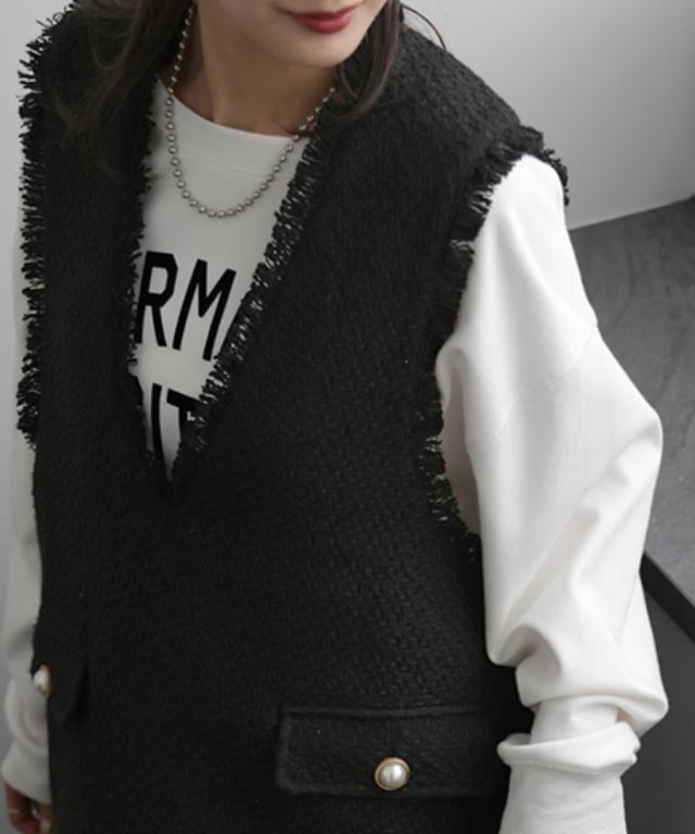 旬。「 お洒落見え 体型カバー 」ツイード ベスト チュニック ツイードベスト レディース レイヤード トップス ロング スリット 深Vネック 重ね着 Vネック お洒落 袖なし お尻が隠れる キレイめ ジレ ビッグ 黒 ブラック 大きいサイズ 冬 秋 HUG.U 秋新作
