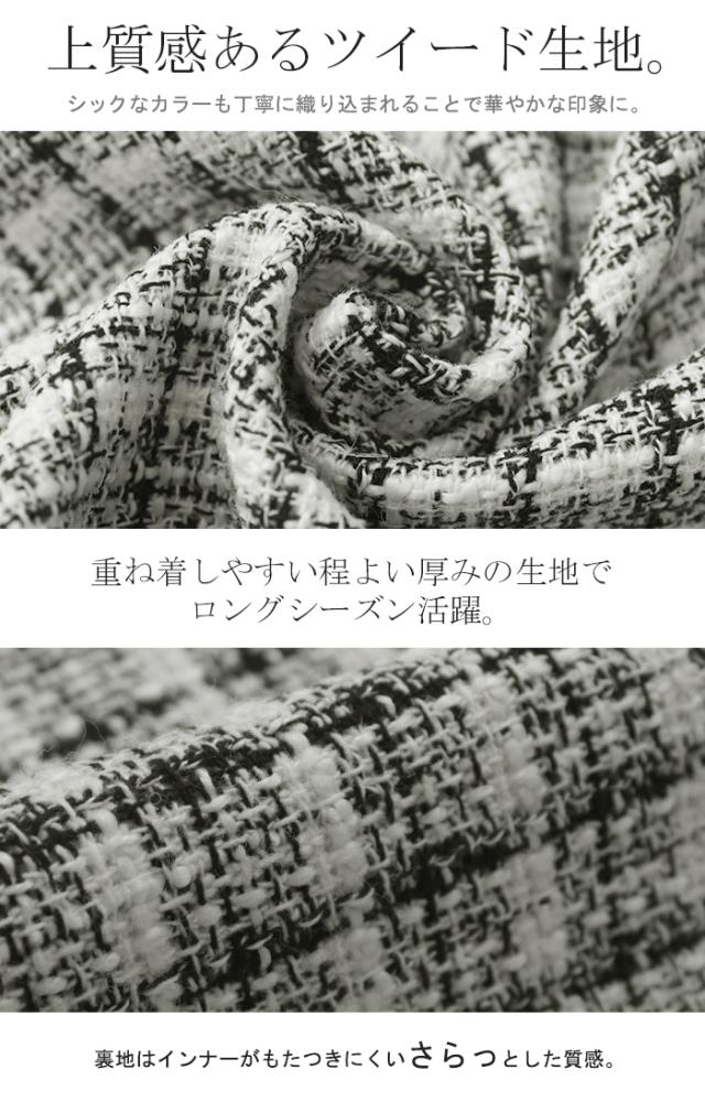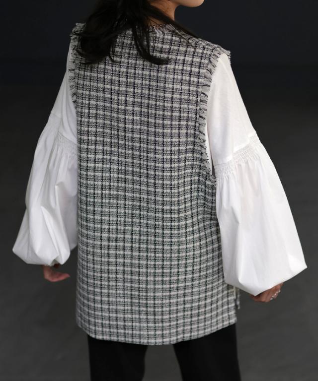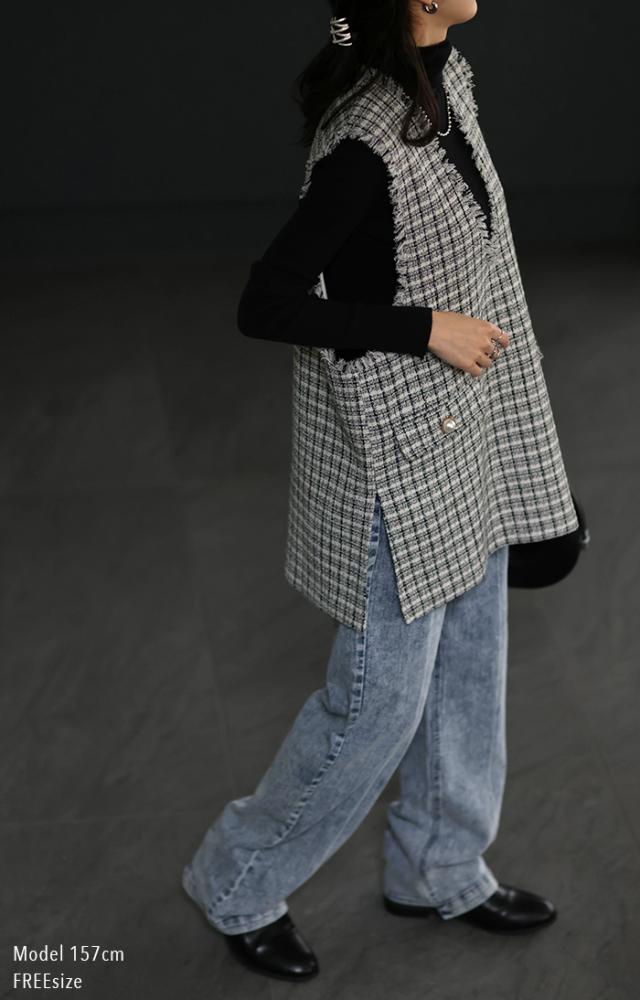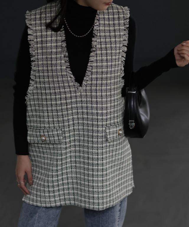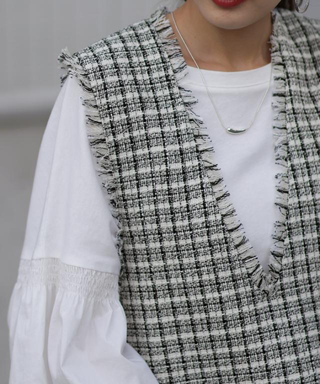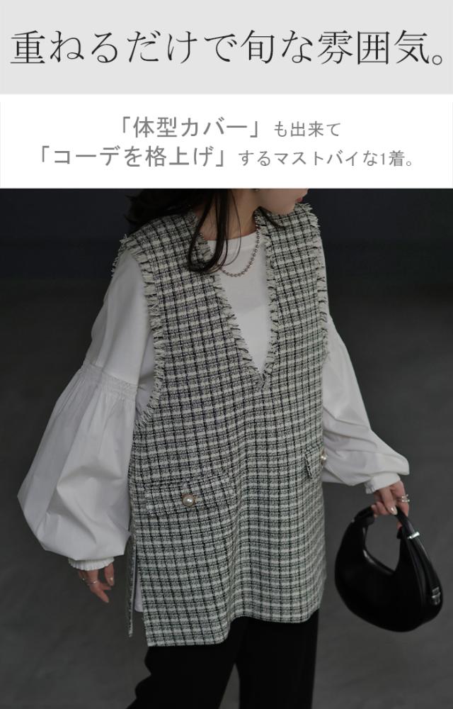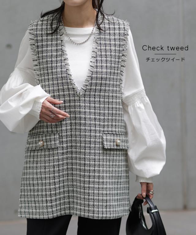 羽織るだけでお洒落さが1ランクアップするチェックツイードデザインのジレです。