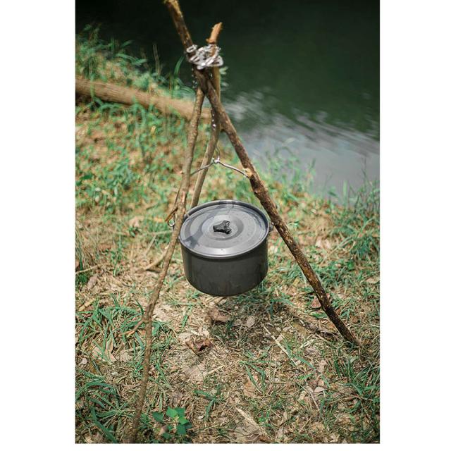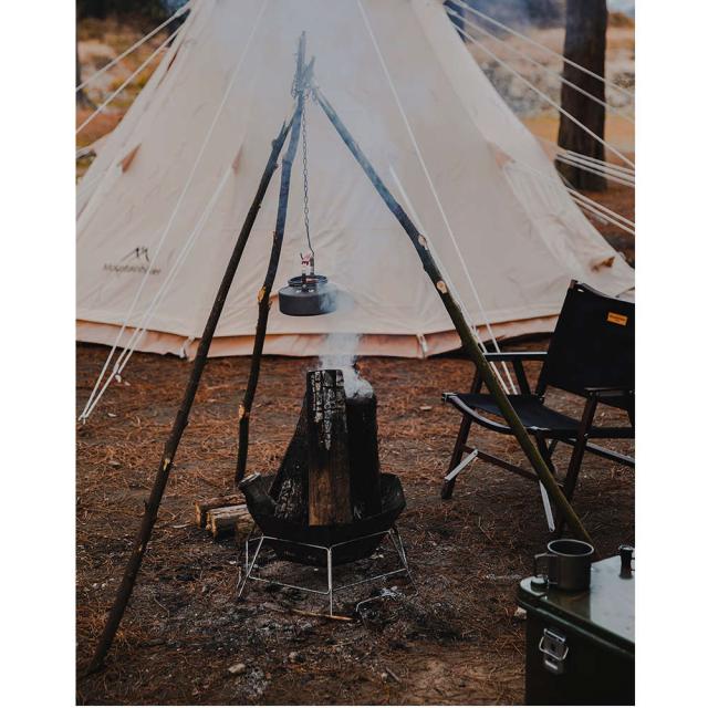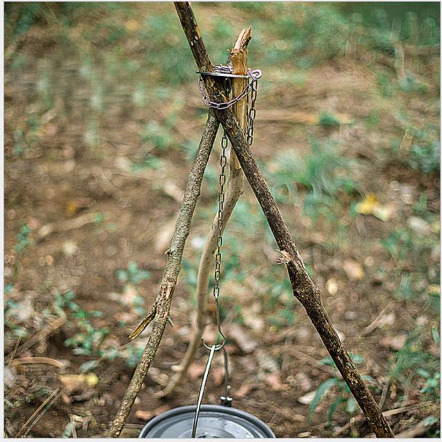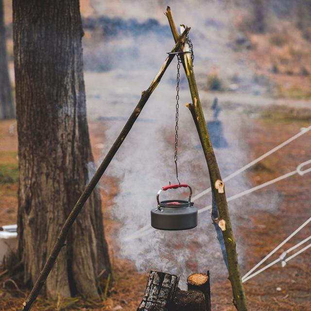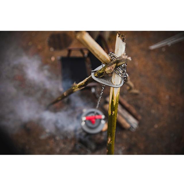 自作のトライポッドハンガーを掛ければ鍋やケトルを吊るせます。
