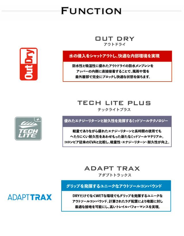防水透湿機能「アウトドライ」が水の侵入を防ぎながらもムレを逃し、シューズ内を快適に保ちます。