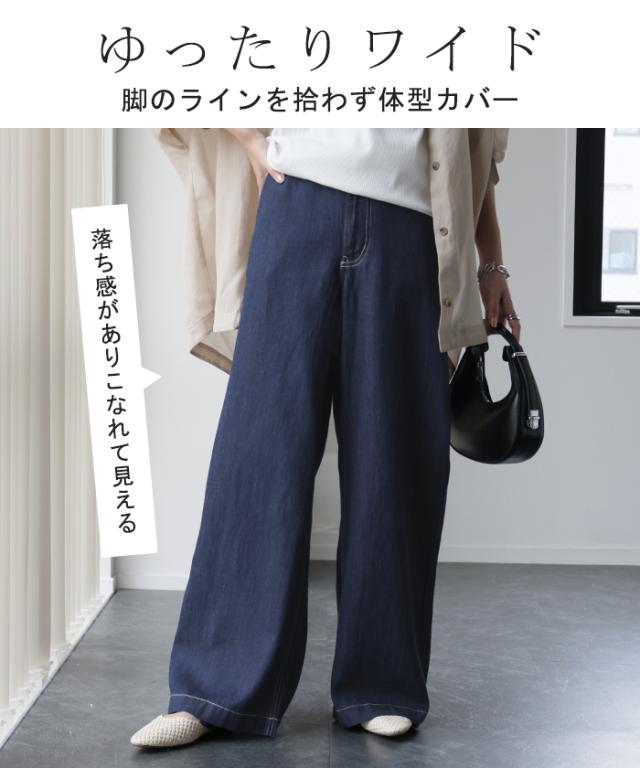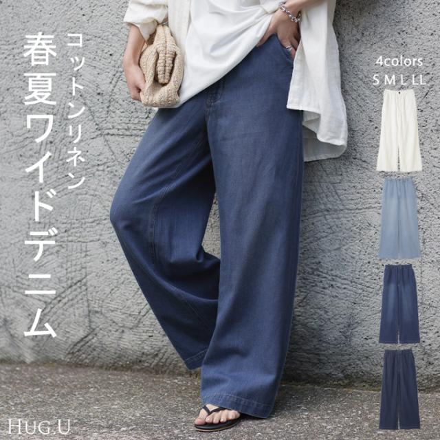 春夏快適。「 綿麻 デニム 」 ワイドパンツ デニムパンツ パンツ レディース ワイド リネン ジーンズ ジーパン ボトム 体型カバー ボトムス ストレート ズボン ゆったり ハイウエスト リネン 綿 麻 ユーズド風 ゴム 冬 秋 小さい 大きいサイズ HUG.U 秋新作