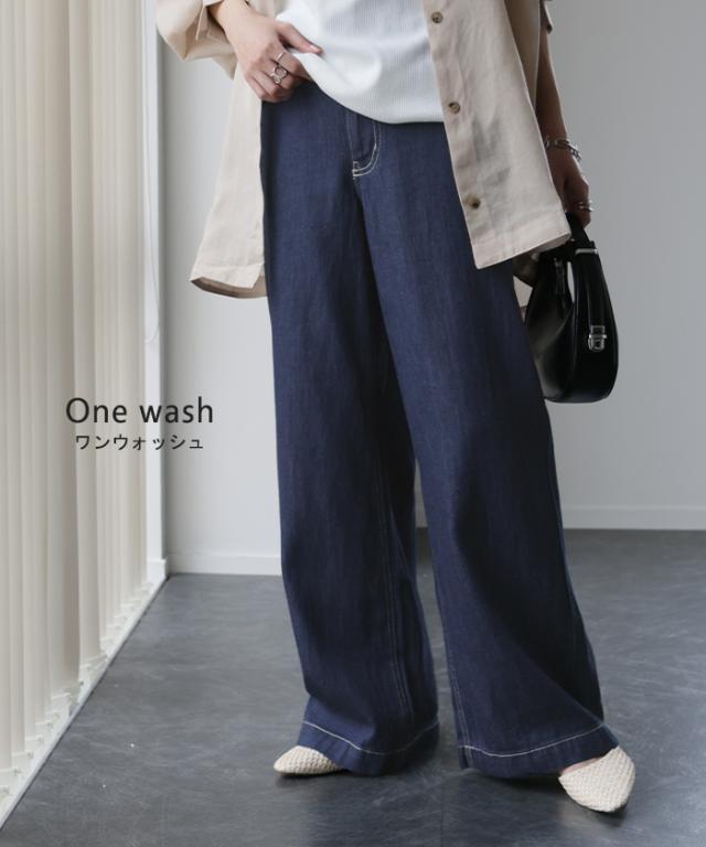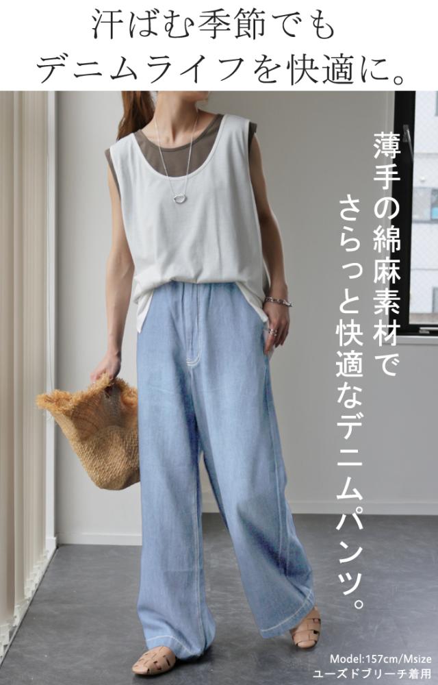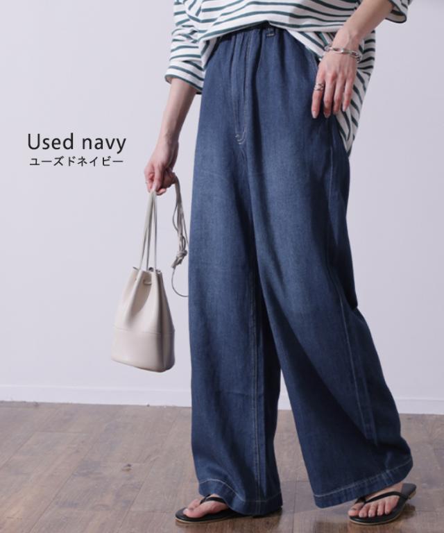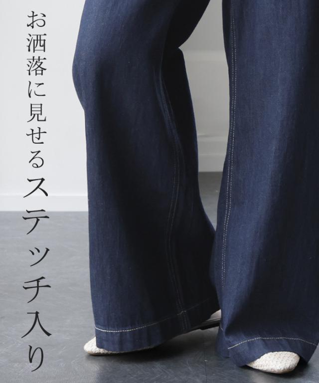 麻混素材のゆったりカジュアルなワイドデニムパンツです。