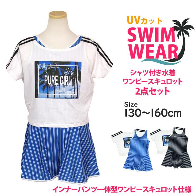 水着 女の子 子供 キッズ ジュニア ワンピース水着 キュロット Tシャツ付き 2点セット 130cm 140cm 150cm 160cm