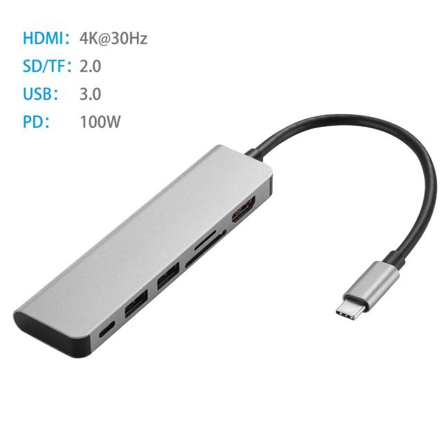 | USB-C 6in1 HDMI4K カードリーダー-USB3.0×2 ハブ付 PD 100W C給電付 アダプタ 18cm |