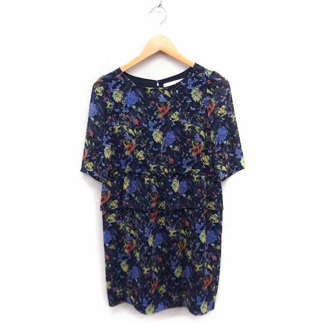 【中古】カージュ Khaju 花柄 ペプラムワンピース 五分袖 ひざ丈 袖透け感 シフォン ネイビー 紺 /FT8 レディース