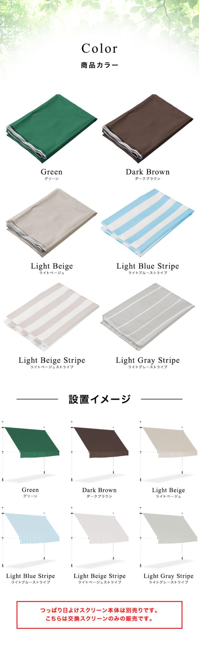 | 特記事項: ※ストライプ柄には生地の真ん中に継ぎ目が入ります。 ※つっぱり日よけスクリーン本体は別売りです。 ※スクリーン部分のサイズが合えば他社製のつっぱり日よけスクリーンにも取付可能です。 |