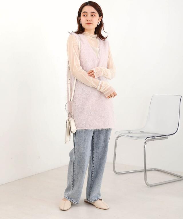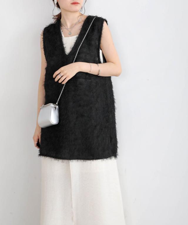 繊細でふわっとしたシャギー素材が着映える素敵なベストトップスが登場です。お尻までしっかり隠れる丈感は気になるところをカバーしてくれます。裾のサイドスリットはボトムと合わせた時に重たい印象にならずに、着用いただけます。