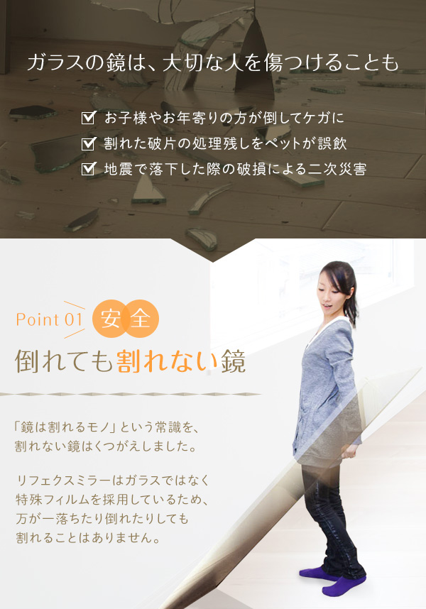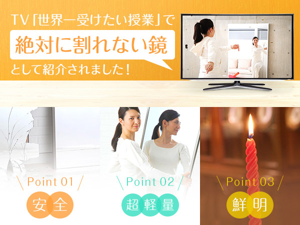 5mm厚のガラス鏡の約1/6と軽量です。市販のフックで簡単に壁に吊下げられます。女性や高齢の方でも手軽に部屋から部屋へ移動が出来ます。硝子ではなくフィルムですので落下したり衝撃を受けても割れたり飛散したりしないので安全です。厚みで映像がダブってしまうガラス鏡に比べ極薄(0.025mm)のフィルムで像を反射するのでゴーストが無く鮮明にくっきりと映し出します。高透明なフィルムを使用していますので肌の色が自然に映ります。反射率が83%と高く鮮明に映し出します。