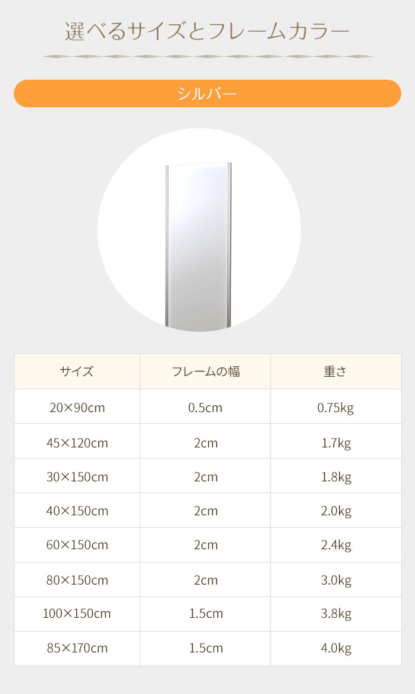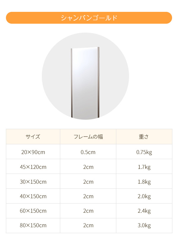 割れない スタンドミラー (幅30×高さ150cm シャンパンゴールド) 日本製 軽量 プロ仕様 両サイド飾縁付 『REFEX リフェクス』 |b04