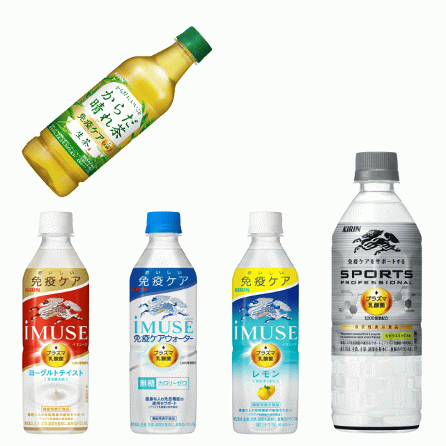 テレビCMで話題のキリンビバレッジ 免疫ケアペット飲料を5種集めました。5種でアソート24本にします。免疫ケアで自分や家族の健康を守りませんか。キリンのプラズマ乳酸菌が免疫機能に働いて、体を内側から守る力になります。